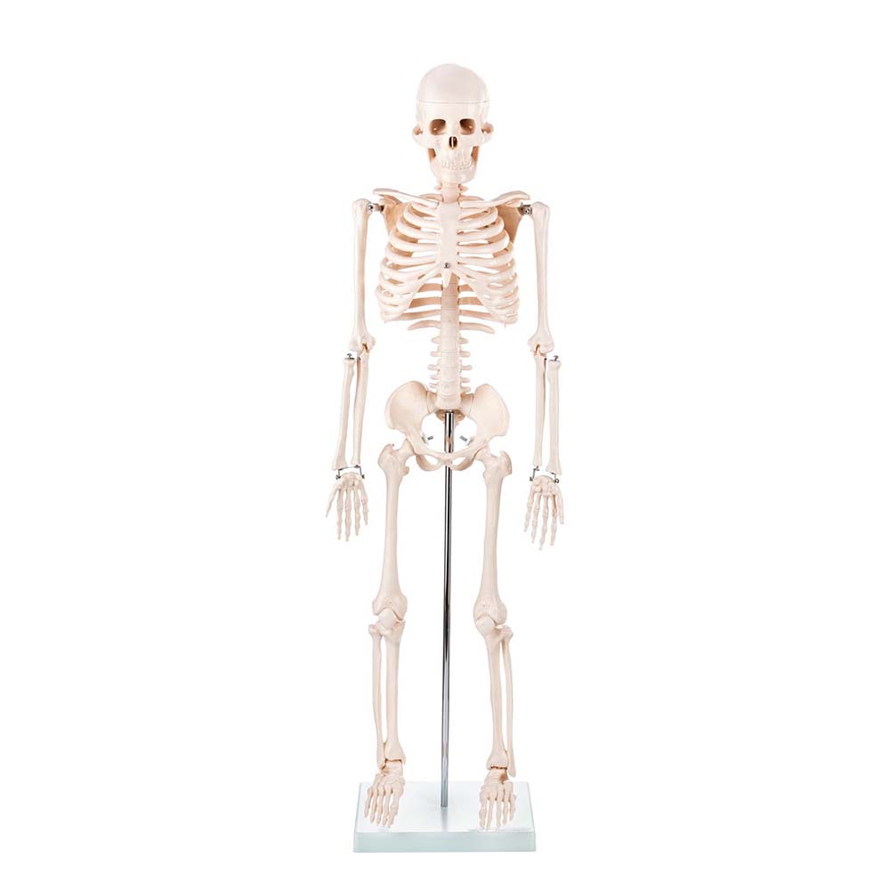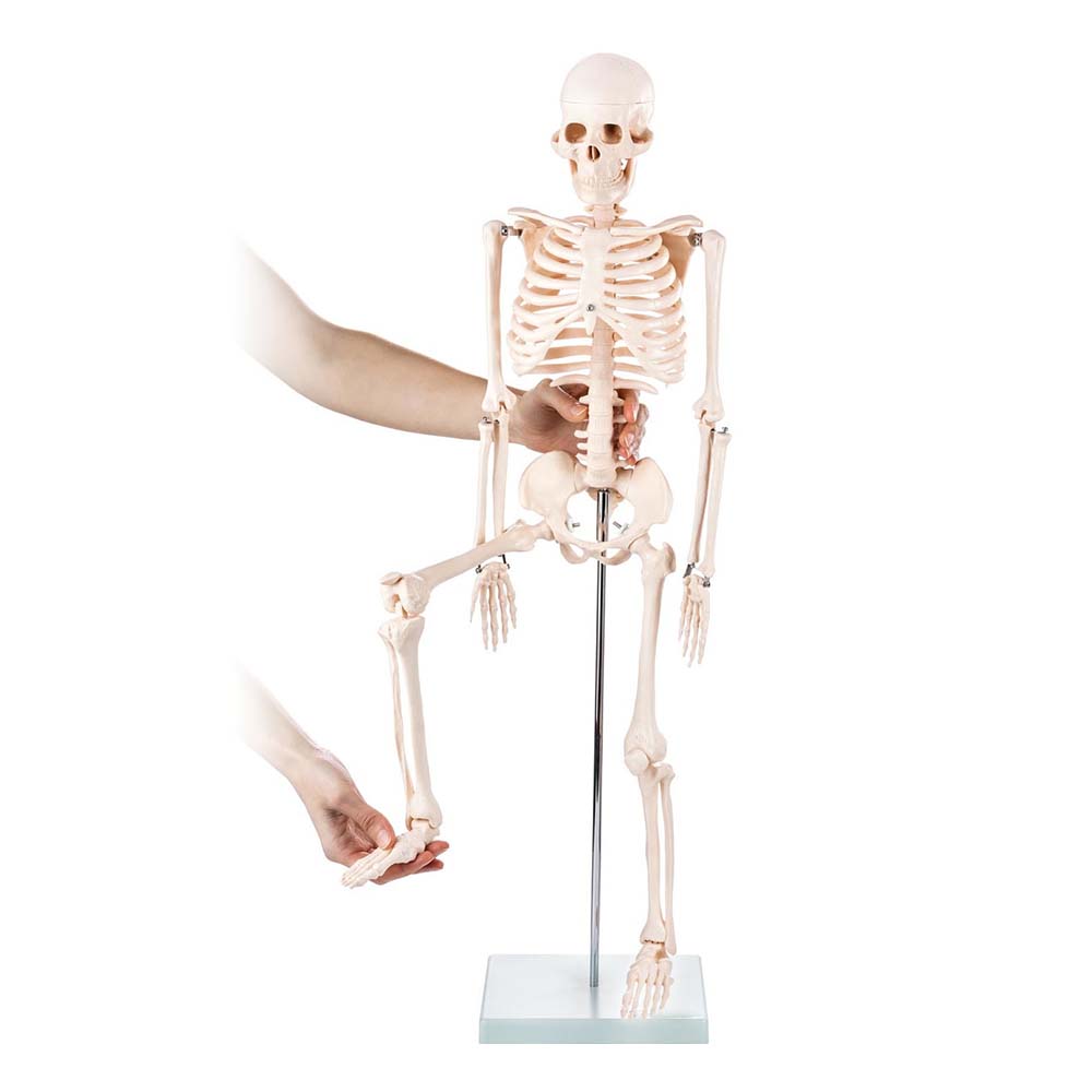 A half life-size plastic skeleton is ideal for teaching the basics of the anatomy of the skeletal system where space is limited. The 85cm tall skeleton represents the 200 bones that make up the human skeletal system, and the limbs can be moved to show an approximation of joint articulation.