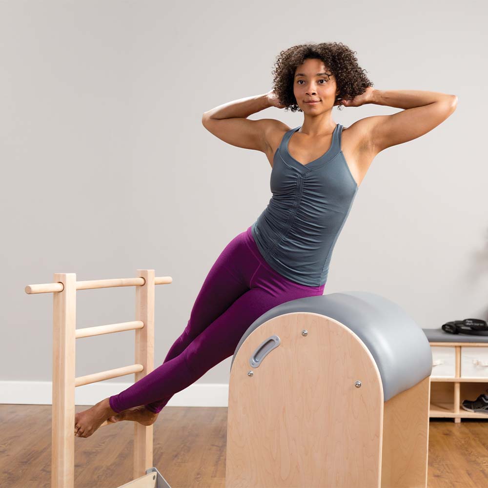 The Balanced Body® Pilates Ladder Barrel for core strength and flexibility exercises. It combines ladder rungs with a barrel surface for stretching, strengthening and flexibility exercises. The barrel connects to the ladder by a sliding base that adjusts to accommodate different torso sizes and leg lengths.