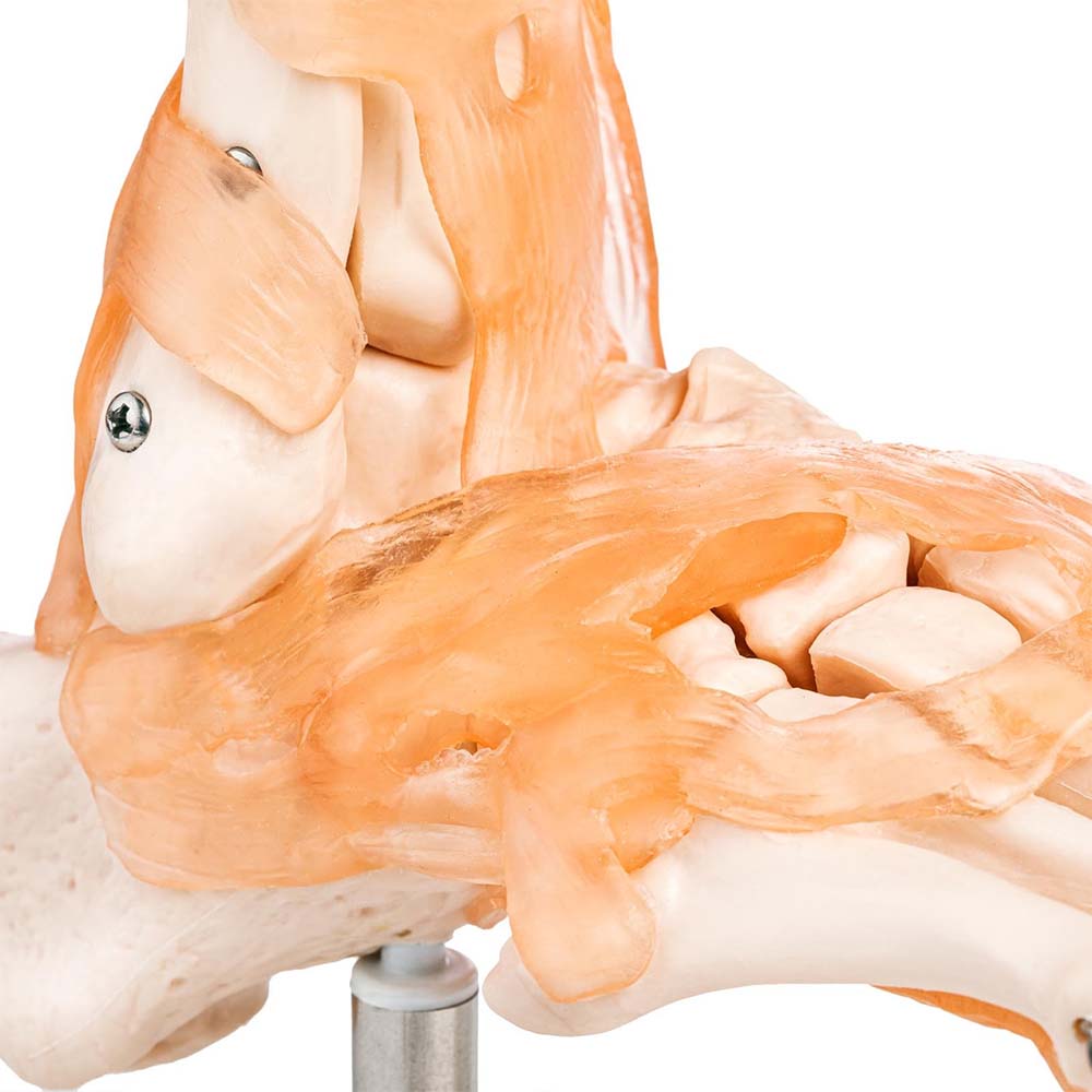 This life-size foot skeleton model shows the bones of the foot and ankle, with ligaments. The ligaments are made of flexible plastic, and movable toes add realism and allow for the demonstration of basic movement function.