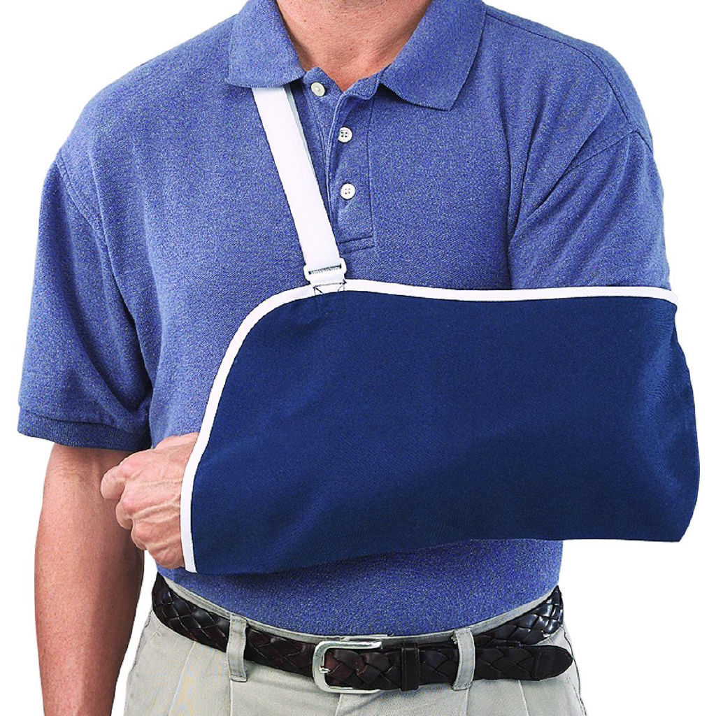Mueller Adjustable Arm Sling supports and restricts movement to assist sore or injured arms and elbows. Helps stabilize the arm to relieve pain and prevent re-injury. Adjustable padded shoulder strap for a custom fit. Lightweight and breathable materials for comfortable all-day wear. Supports left or right arm.