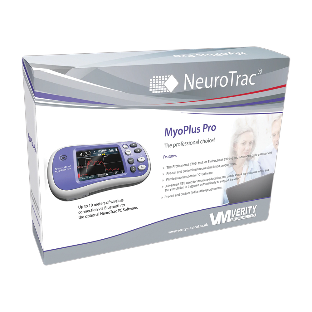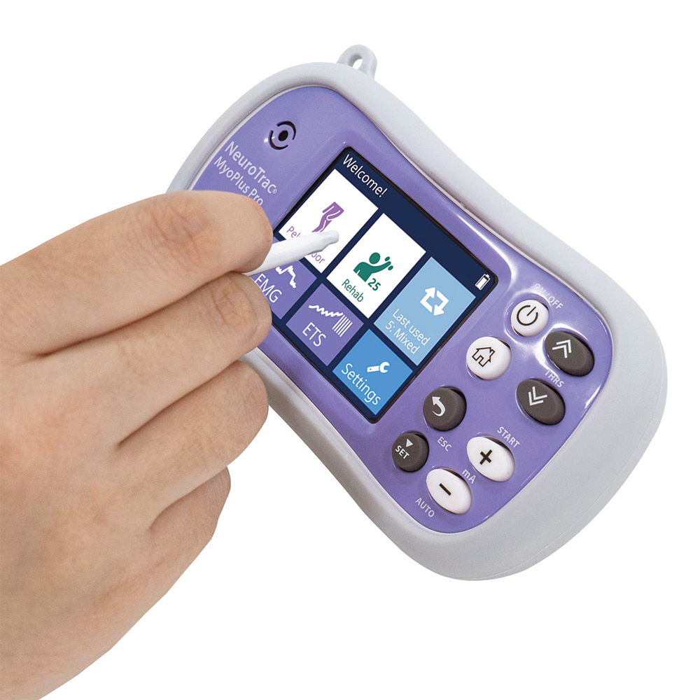 With the MyoPlus Pro, you can use EMG biofeedback and neuromuscular stimulation separately or together. This method is widely used in sports therapy clinics and is particularly good for treating stroke, sports injuries, patellofemoral pain, Bells Palsy, back pain and a wide range of muscular problems, as well as all types of incontinence and prolapse. The NeuroTrac MyoPlus Pro uses EMG diagnosis to determine muscle strength and ETS and Neuromuscular Stimulation to actively exercise the muscles, allowing you to exercise and track your muscle strength as you go. This new model has a full-colour LCD touchscreen, adding a whole new level of interactivity to the treatment! Suitable for use by both adults and children, it features user-friendly software and games that help patients to understand what they need to do in a way that's simple and fun. It has been designed for use both by physical therapists and for at-home users as a learning and feedback tool. Its Bluetooth connectivity and PC software make it easy to track progress and produce reports.
