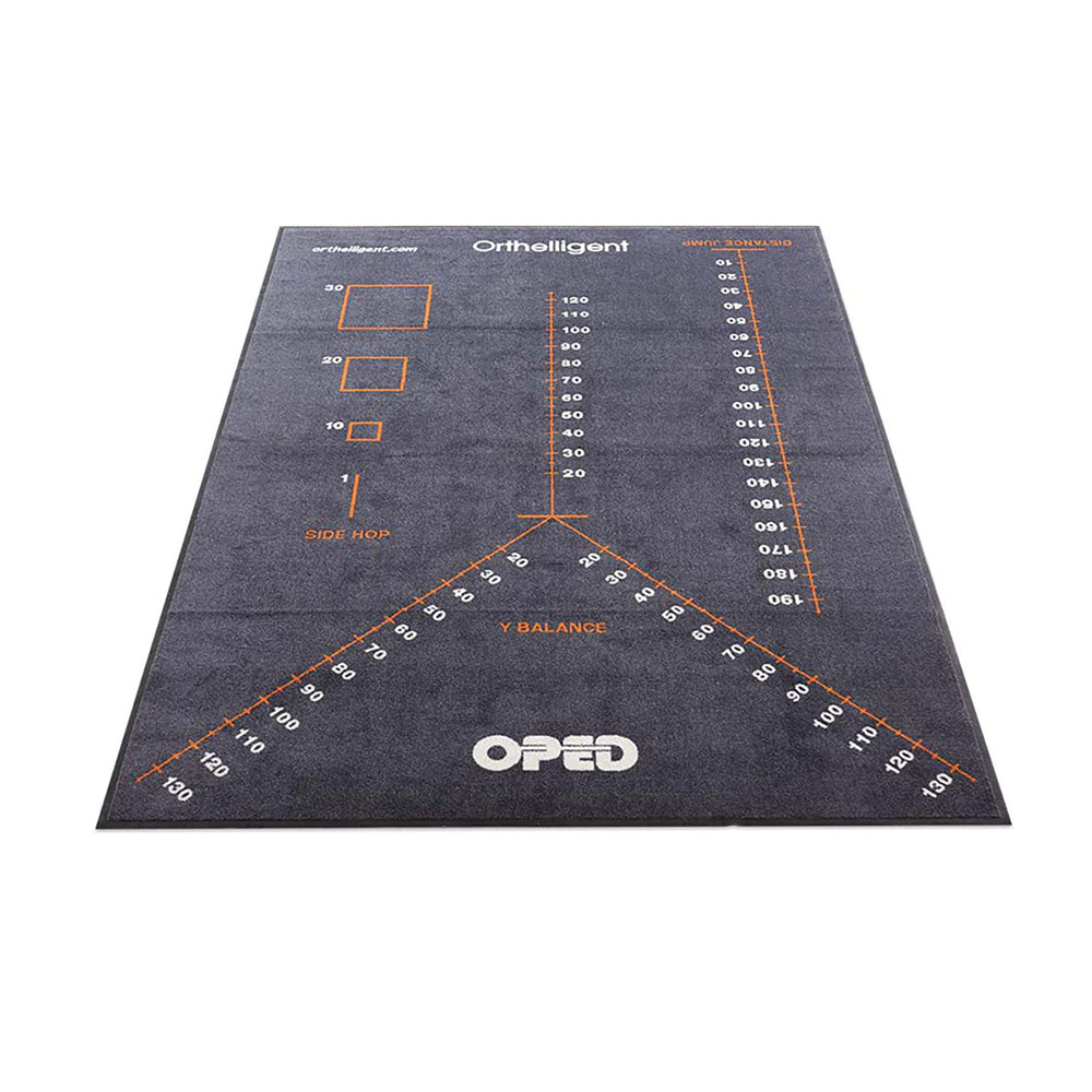 Many functional tests can be performed easily by using the Orthelligent Screening Mat. The corresponding marks are printed on the mat for the most common tests, such as the Y-Balance, Square, Side Hop, and distance jump. Moreover, all other tests can be performed centrally on the mat on a soft surface. Due to the robust rubber coating, the mat is non-slip and dimensionally stable. The space-saving dimensions of 2m x 2.8m ensure that the mat fits into almost any room and is also easy to store and transport.