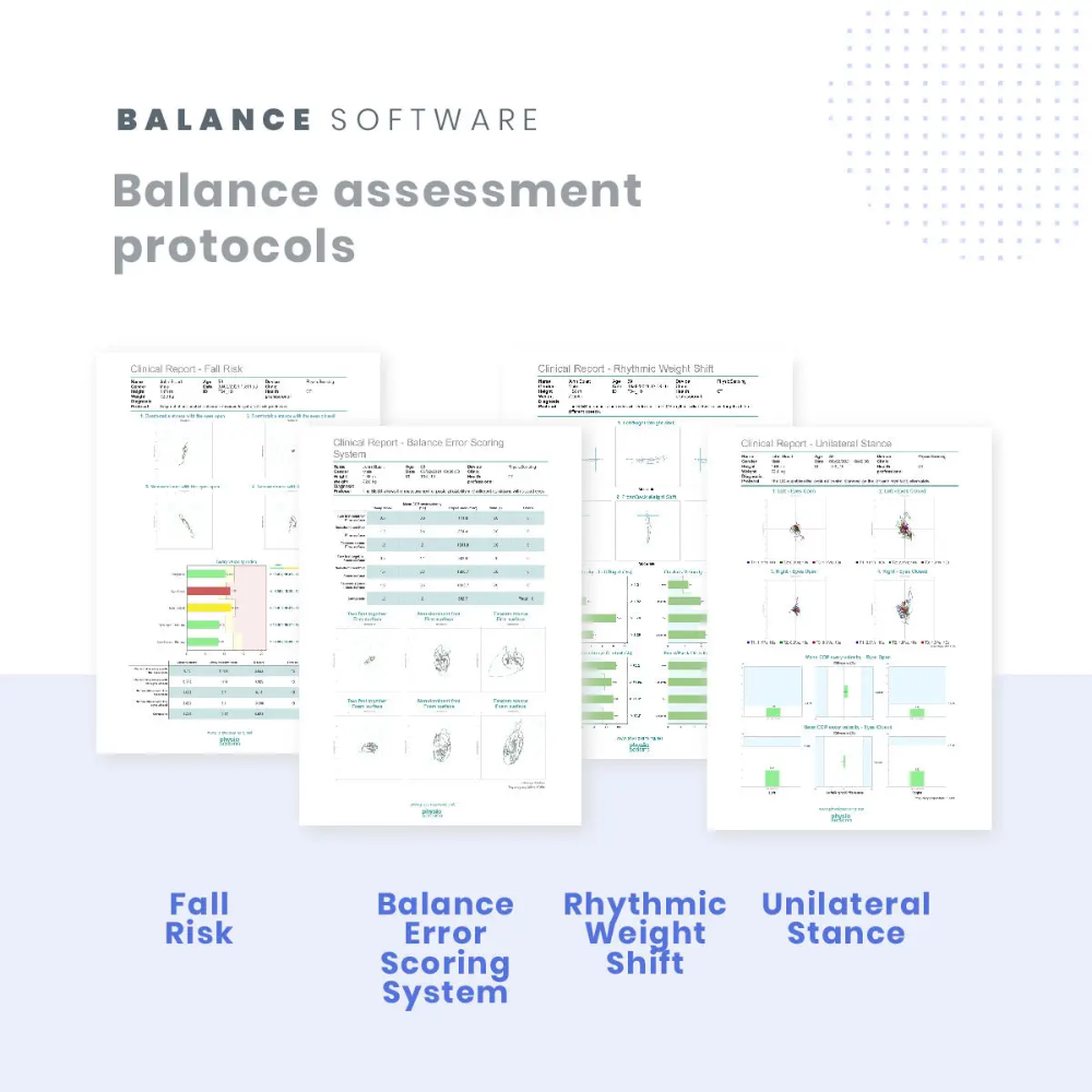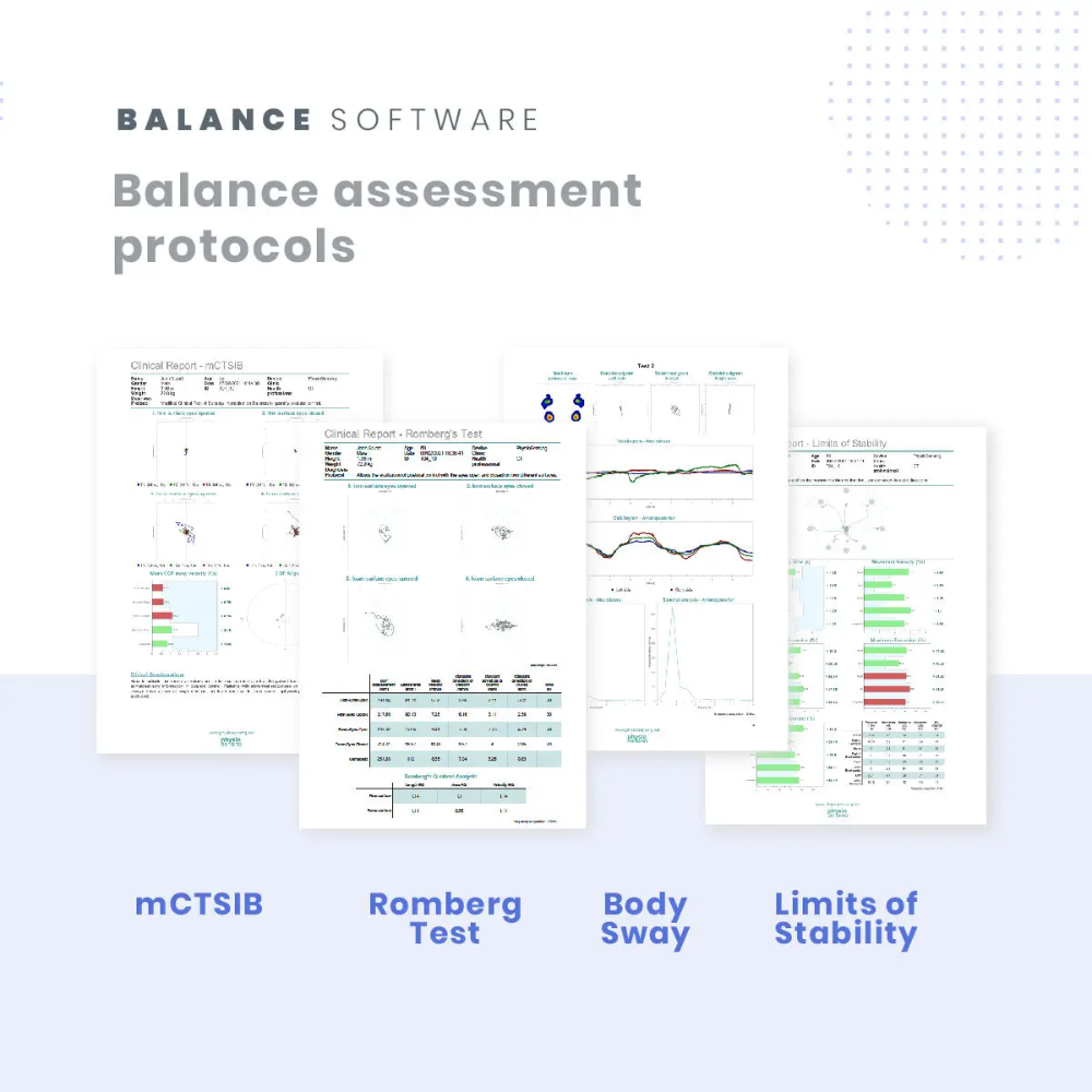 - Pre-loaded Clinical Assessment Protocols: Includes built-in protocols widely used in balance testing: