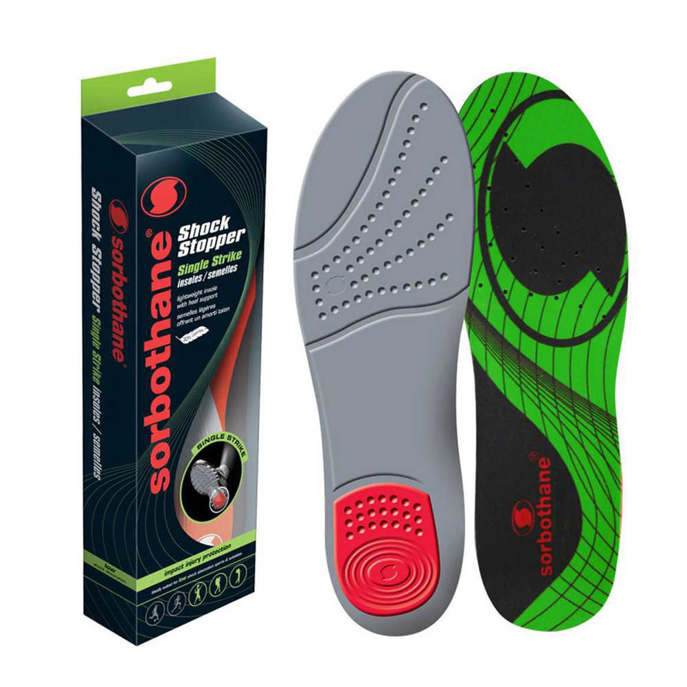 The Sorbothane Shock Stopper Single Strike Insoles features targeted Sorbothane heel protection with a moulded heel cup with shock-absorbing qualities. The patented Sorbothane Viscoelastic compound mimics the characteristics of human flesh and absorbs 94.7% of vibrations on impact and also it helps to prevent heel pain and heel spurs.