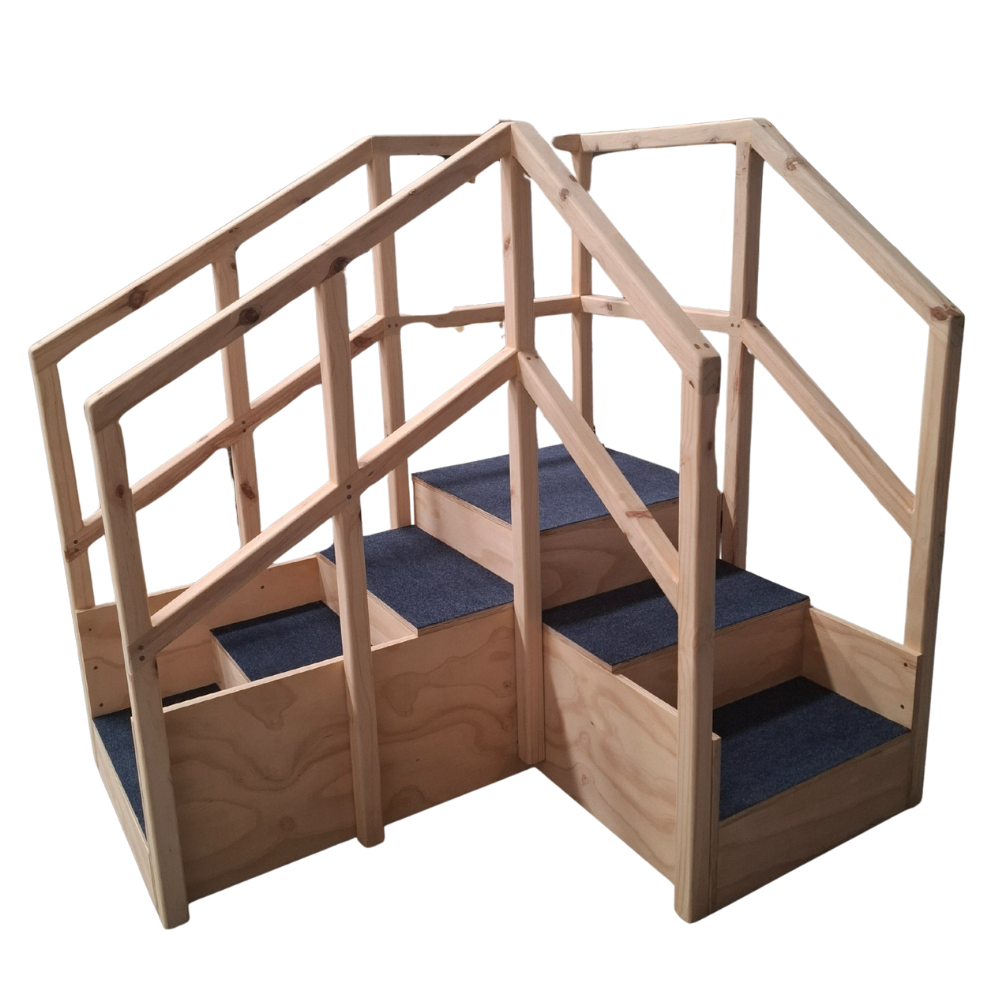 This dual-sided wooden training staircase is designed for use in rehabilitation, physiotherapy, and mobility training environments. Built from high-quality, durable pine wood, it provides patients with a stable and safe structure for practicing step-up and step-down movements. The staircase features two different step configurations — a three-step side and a two-step side — allowing therapists to adjust exercises according to patient progress and ability levels. Non-slip carpeted treads ensure secure footing and confidence during training.