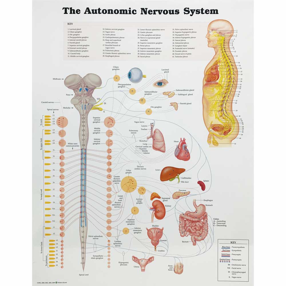 All nerves are labelled. An ideal chart for learning or explaining the anatomy of the autonomic nervous system.