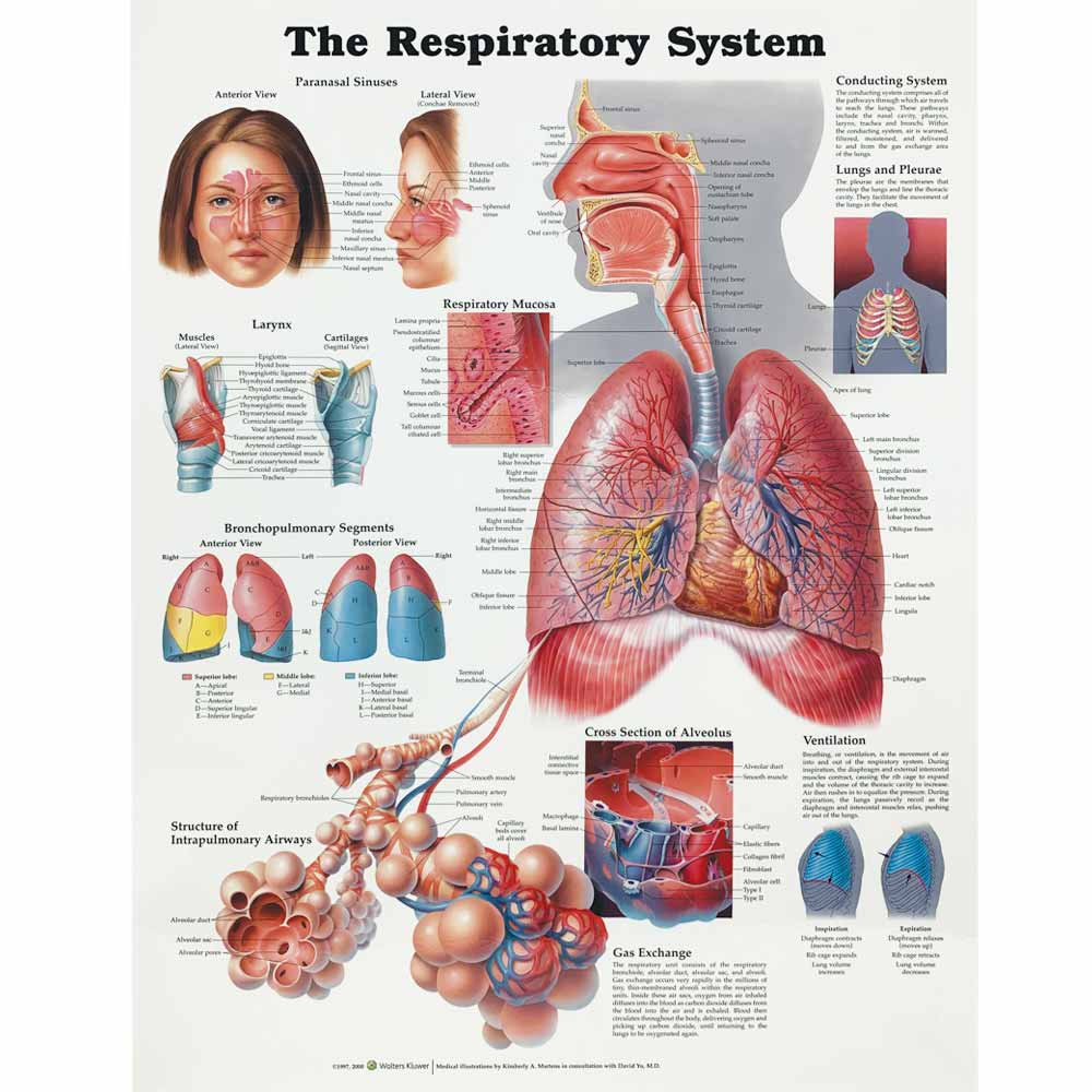 This laminated respiratory system poster by the Anatomical Chart Company provides a great introduction to the anatomy of the lungs. Covering the complete respiratory system from the frontal sinus to the diaphragm.