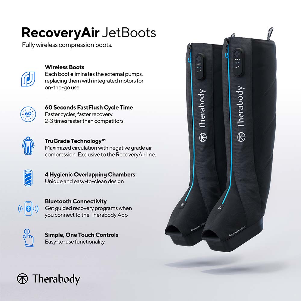 RecoveryAir JetBoots makes recovery more convenient than ever without the need for cords. It eliminates the external pump and tubes, replacing them with integrated motors packed into a sleek, compact design for easy storage and on-the-go recovery. One-touch controls on the boots make for fast and easy use. With FastFlush Technology, RecoveryAir JetBoots reach the optimal point for a complete and rapid pressure release in just 60 seconds–making it 2-3x faster than competitors for quick recovery. Ultra-portable, convenient and fast.