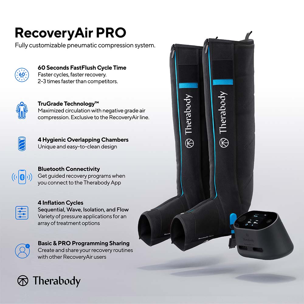 Make your Recovery PROFESSIONAL with the Therabody RcoveryAir PRO. Therabody is revolutionizing pneumatic compression with the all-new RecoveryAir product line, the future of pressure massage.